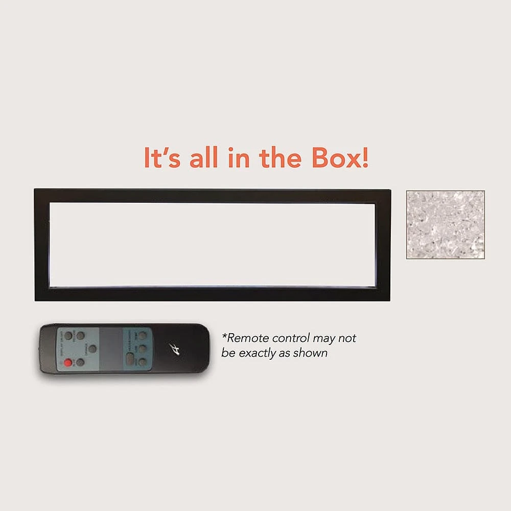 The fireplace also features an integrated fan-forced heater that is capable of producing supplemental heat for areas up to 400-500 SQ. Ft.. With the unique, angled front glass, the heat is forced down the front of the unit and out into your room, for maximum heat disbursement. Choose from low or high heat settings or engage the Auto setting which will automatically regulate the heater based on predetermined factory temperature settings. A convenient hand-held remote control is also included with the fireplace, allowing for easy operation of the various firebox features.