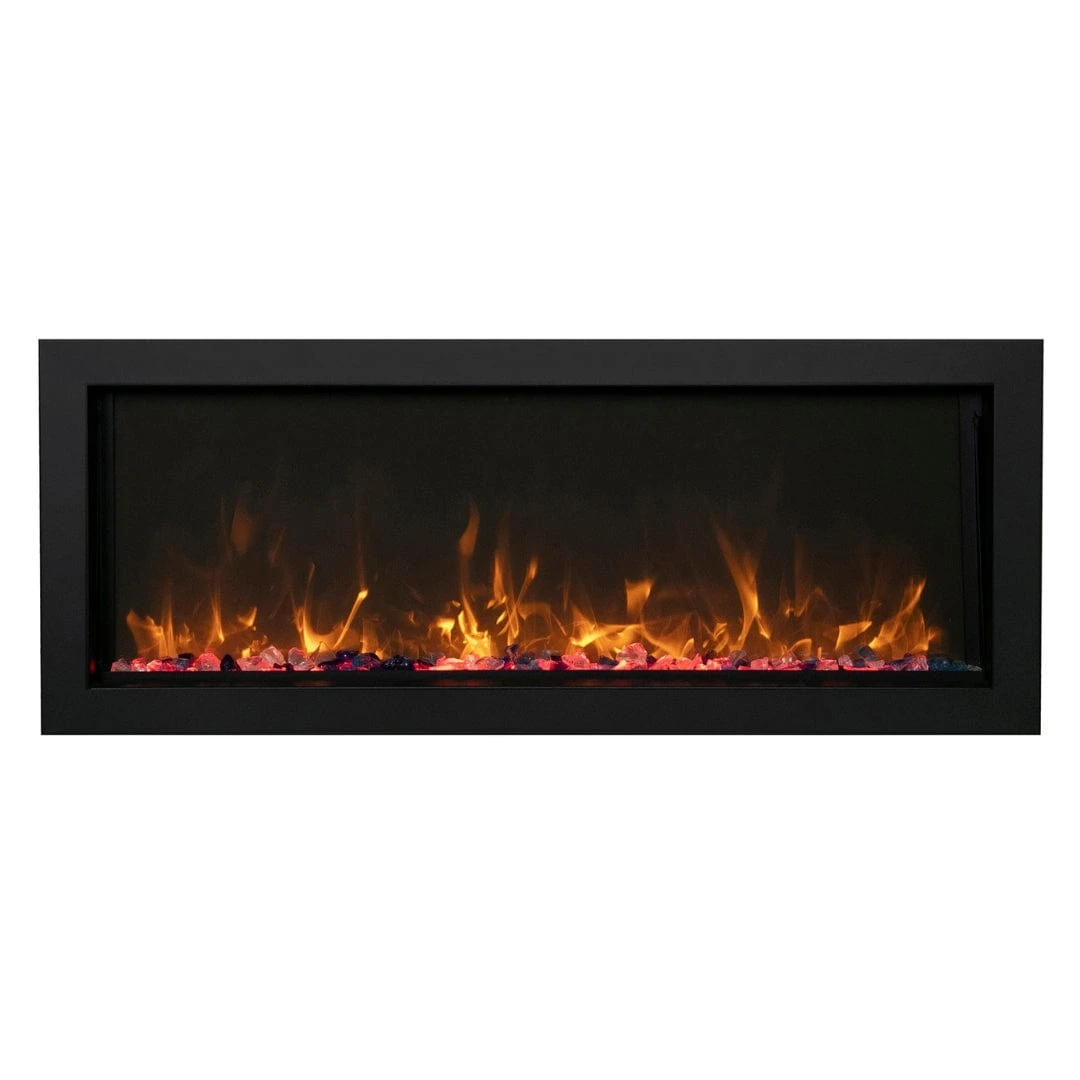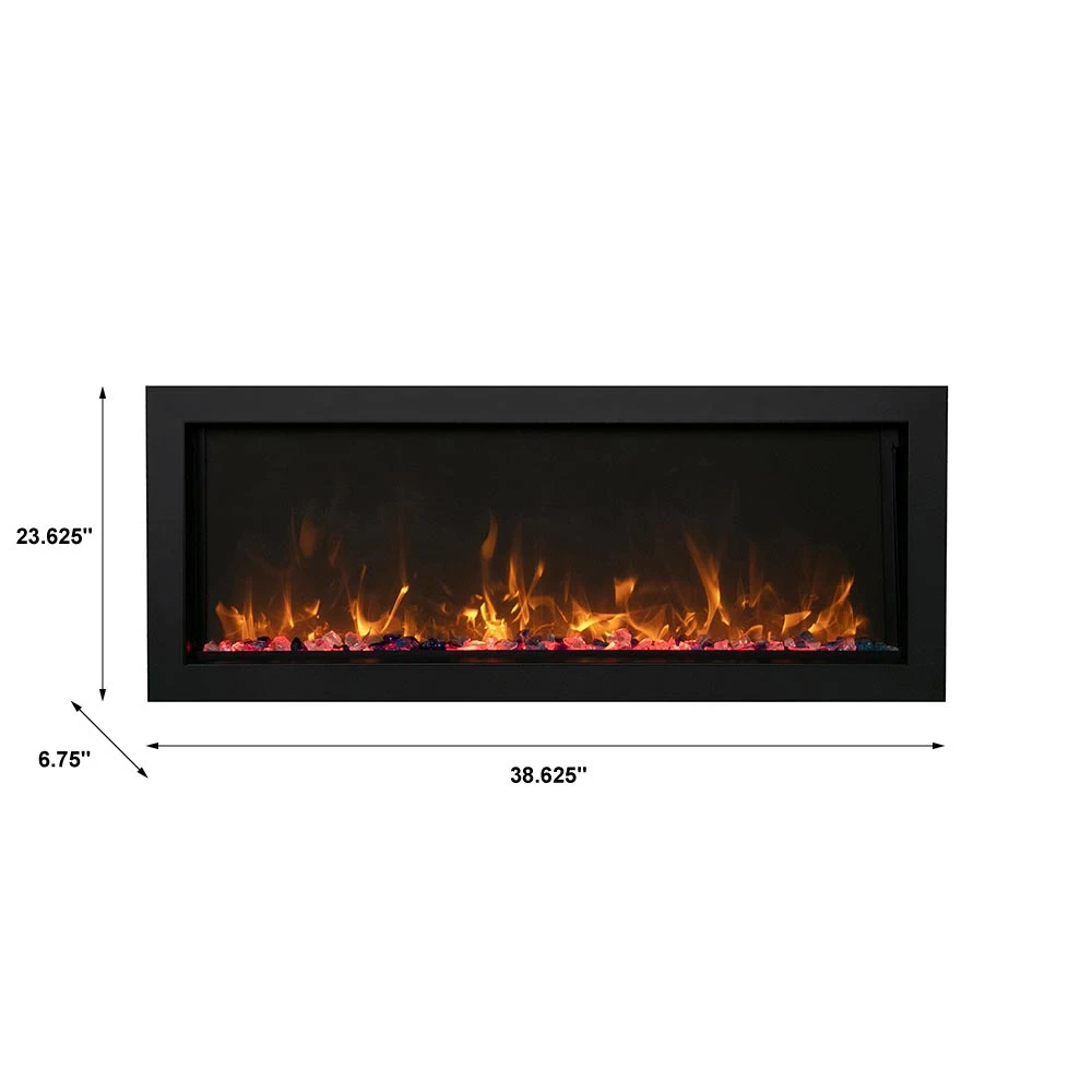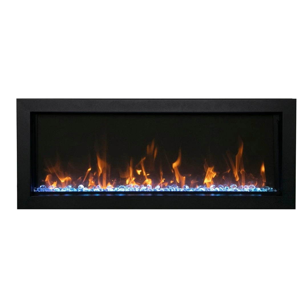 The Amantii Panorama Series 40-In Slim Built-In Electric Fireplace is a stylish unit that will bring contemporary appeal to your residential or commercial space. At just under 7 inches deep, you’ll have no trouble installing the fireplace into most drywall applications. The unit is designed to be fully recessed, and can be installed with your finishing material coming right to the edge of the glass or with the included black trim piece. A unique feature of this unit is that it can be installed both indoors and outdoors. Create a relaxing outdoor space in your covered porch/patio or add pizzazz to your family room, bedroom or media room with this stunning firebox as the focal-point. With a bright and dramatic flame effect (that can alternate between various colors) you’ll be able to create a setting that fits your specific tastes and mood. Giving you more options for how you want your fireplace to look, the unit comes with multiple media bed options. Choose from clear and blue glass diamonds or large glass nuggets. Pick one and stick with it, or change them out whenever it strikes your fancy, the choice is yours.