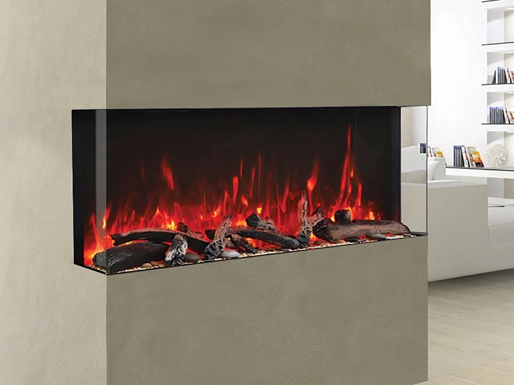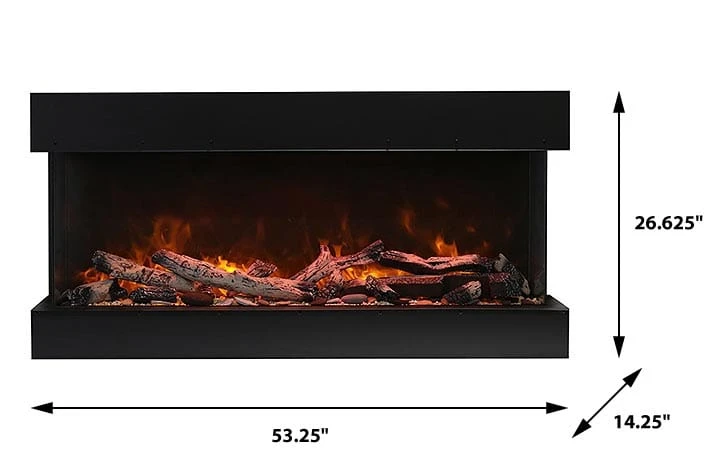 Create 4 different, contemporary looks with the Amantii Panorama Series 50-In 3-Sided Built-In Electric Fireplace. This remarkable unit features 3 glass panels that give a virtually seamless, 180° view of the dazzling flame effects. Choose to display the unit with all 3 sides open, just the left side open, just the right side open or only the front open. You’re able to accommodate several different looks and installation types all within this one, versatile unit. The firebox is designed for indoor/outdoor, built-in applications and requires your finishing materials to be built flush to the glass. With such an immersive view of the fireplace, you and your guests won’t be able to take your eyes off the contemporary and artistic flame effects. These vibrant, LED flames produce a rhythmic pattern that creates a soothing and relaxing effect. The adjustable flame colors allow you to create a look that complements your mood – from traditional oranges to contemporary blues and purples. A 13 color canopy light produces even more customizable displays to fill your room with a truly unique ambiance. Whether you prefer a more modern or traditional look, the firebox comes with a Designer Media Kit which includes a 14-piece log set, stones, pebbles & black fire glass.