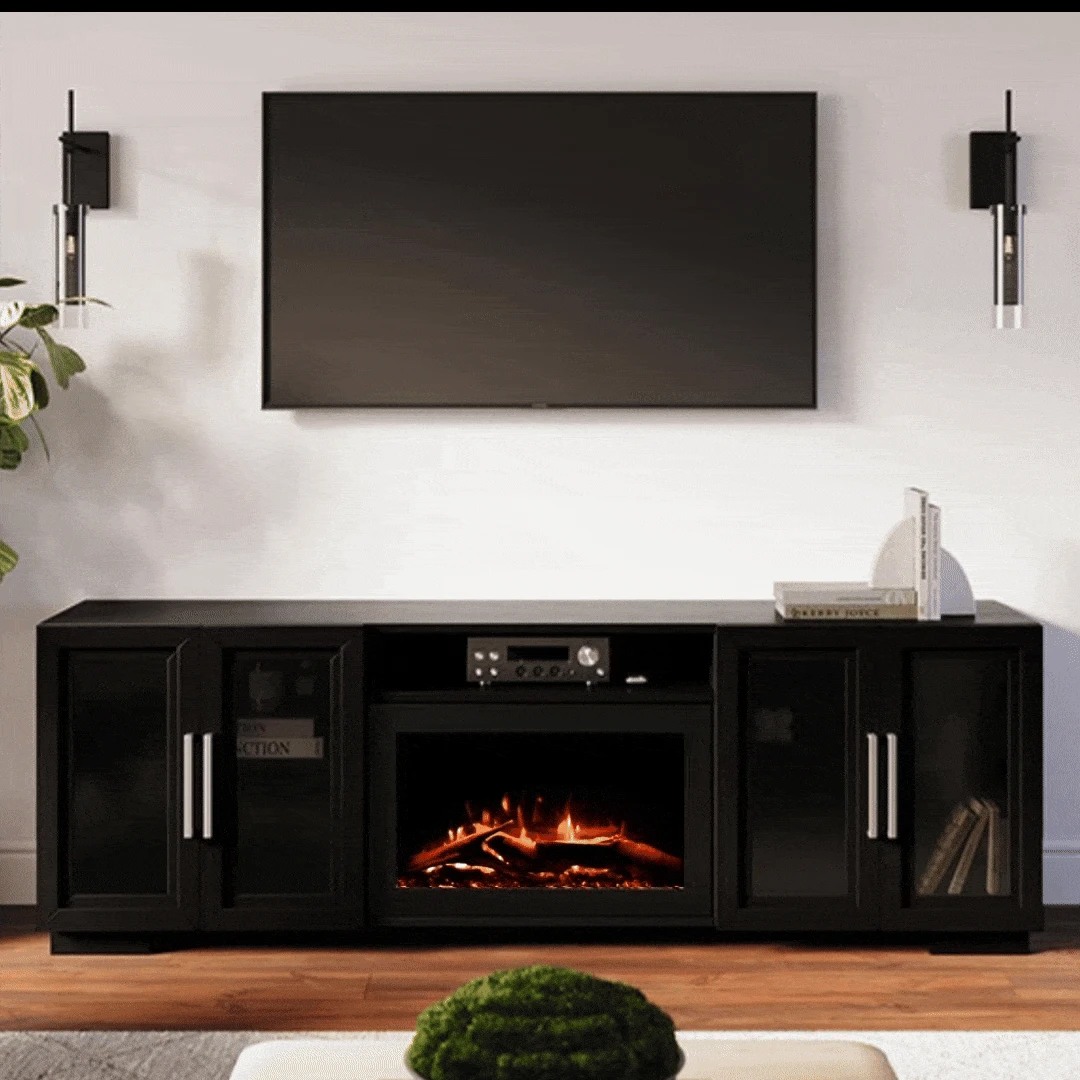 Upgrade your living space with the Modern Ember Channing 80-in Smart Black Electric Fireplace TV Stand, a perfect fusion of striking contemporary design and practical functionality. Crafted with a sleek black finish, this TV console embodies modern sophistication. Its clean lines and minimalist aesthetic make it a versatile addition to any room, adding a dramatic and moody vibe to the room. Smoked glass front side cabinets with glass shelves provide a stylish storage solution with wire management to keep your consoles organized.
