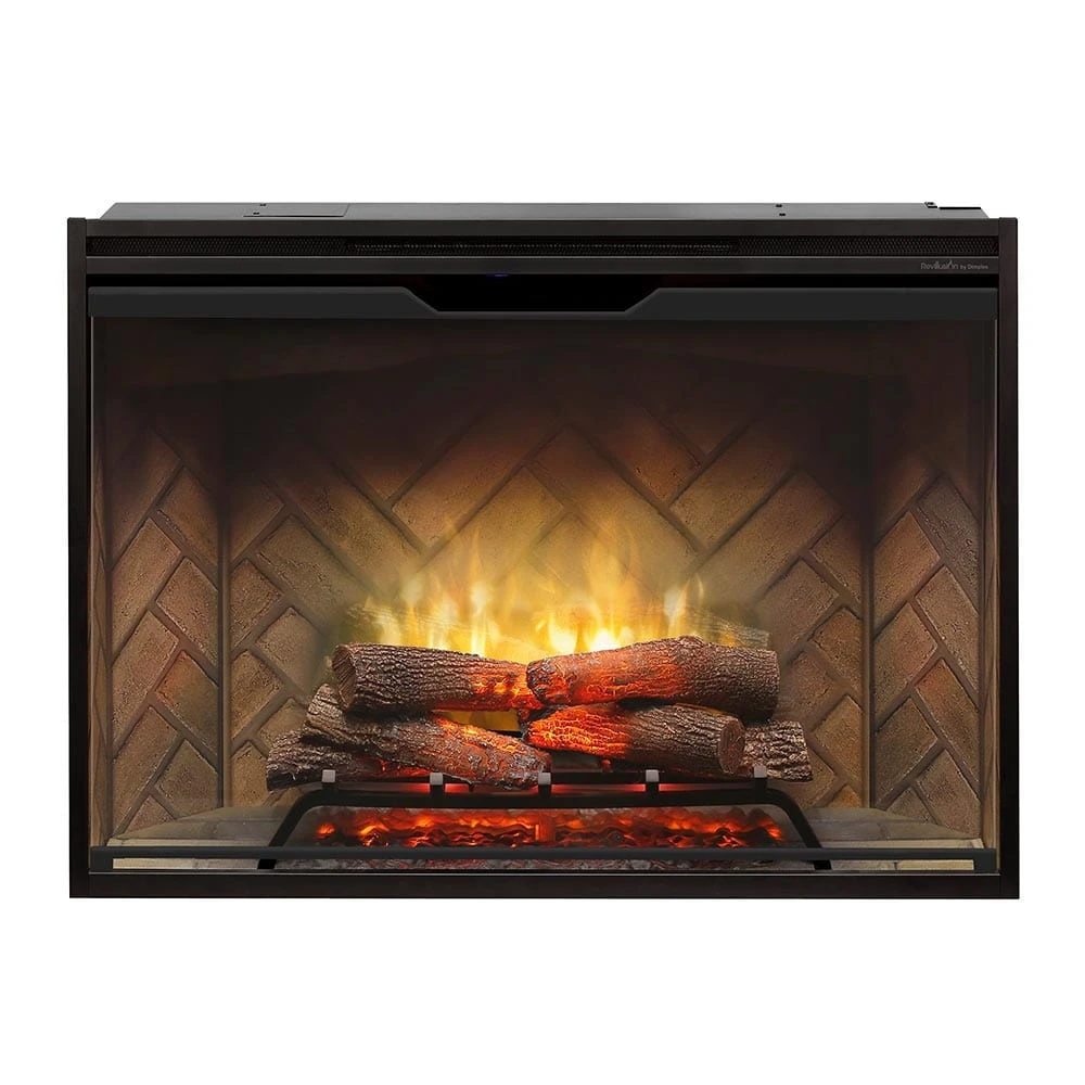 Experience the beauty of realistic flames and life-like handcrafted wood logs with the Dimplex Revillusion Series electric fireplace. This 42-inch electric fireplace insert allows you to set the perfect ambiance with adjustable flame colors, dimming capabilities, and mood lighting that illuminates the interior firebox. The translucent acrylic panel reflects the flames off the herringbone brick interior, while the firebox lighting automatically adjusts to match the room’s lighting conditions day or night.
