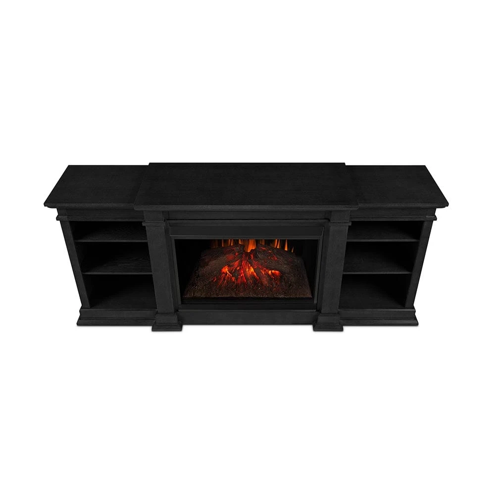 Real Flame’s Eliot Grand Media Console provides a stately addition to your space. Elegant lines, generous mantel space, and desirable shelving showcase your electronics and art objects. A functional centerpiece that provides warmth and comfort, the Eliot Grand Media Console is available in Black for a classic aesthetic that complements an array of room designs.