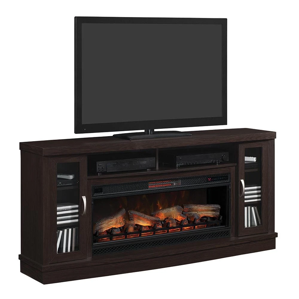The Hutchinson Infrared Electric Fireplace Entertainment Center in Oak Espresso is an appealing design that is simple in style, yet will make an impactful presence in your home. This extra wide media console can accommodate flat screen TV’s up to 80″ and 155 lbs, so you’ll have no problem creating a jealousy inducing home theater setup. The open center shelf is perfectly sized for your DVD player and cable box, or even soundbar, depending on your needs. Two glass-fronted cabinets anchor both sides of the firebox with ample storage for electronics and accessories. Give your room contemporary appeal with the addition of this beautiful entertainment cabinet.