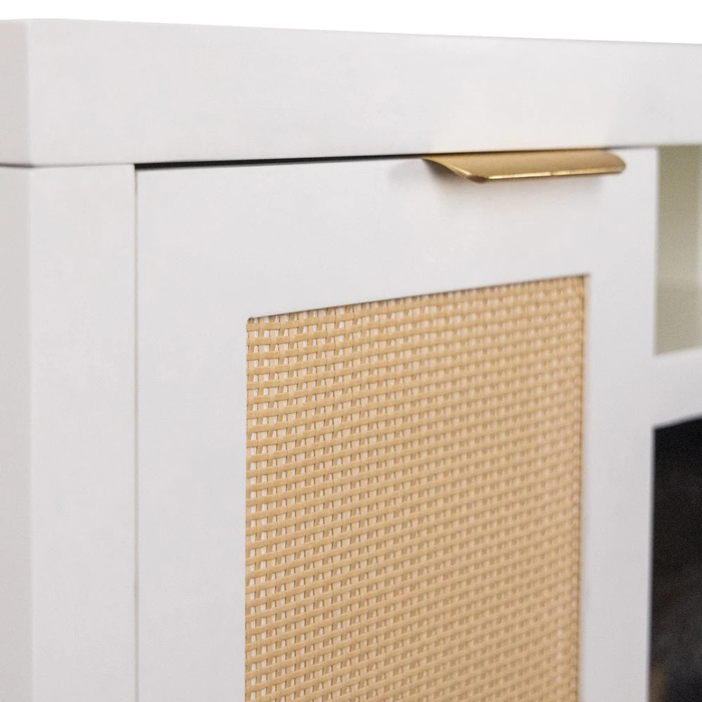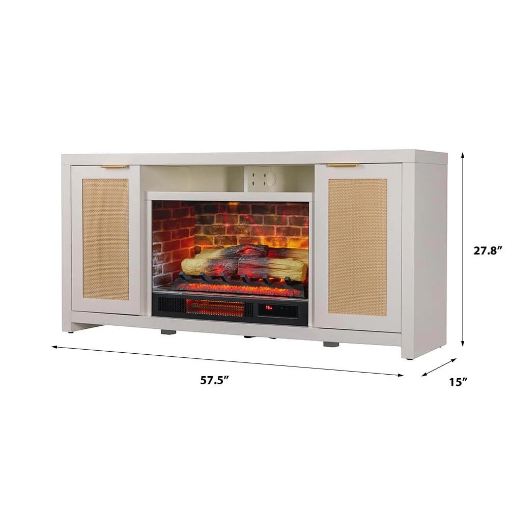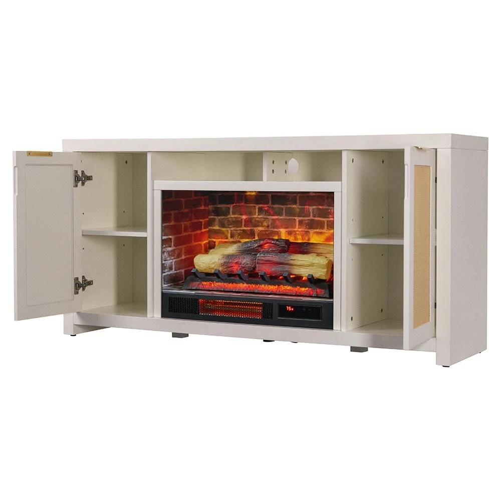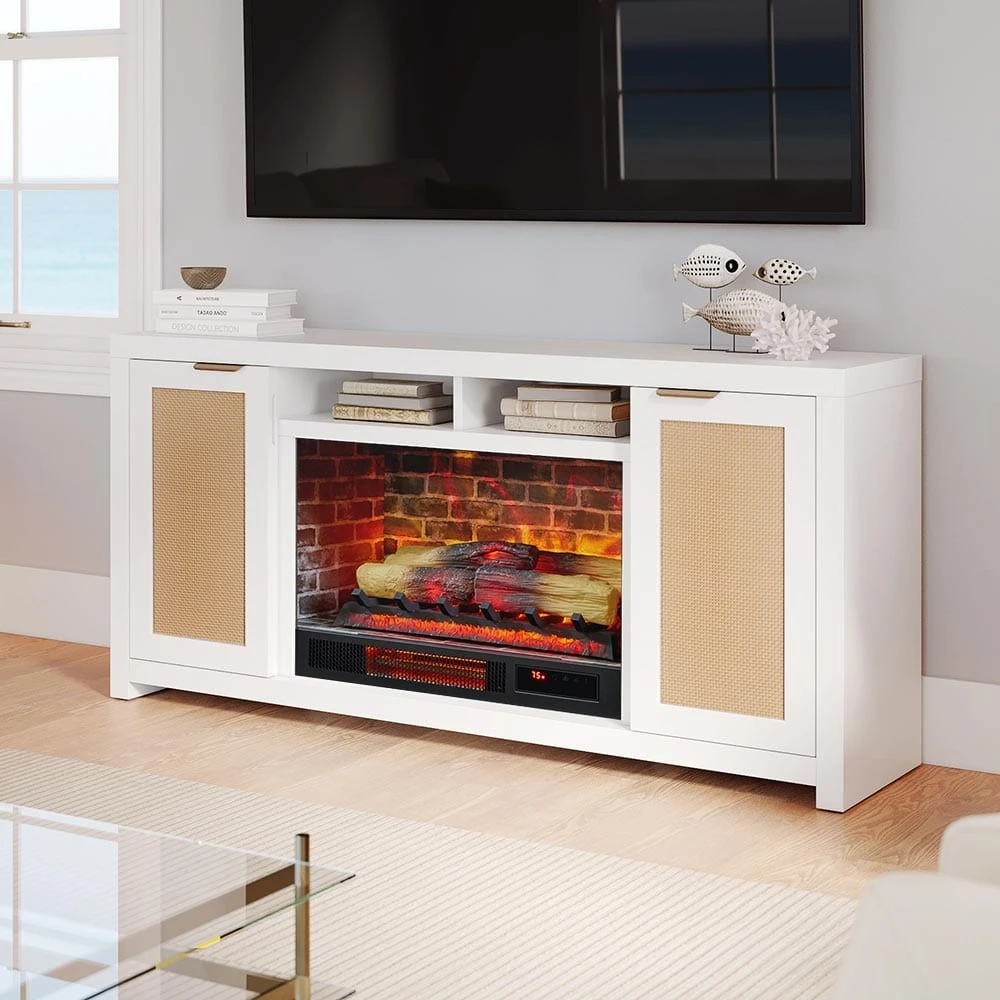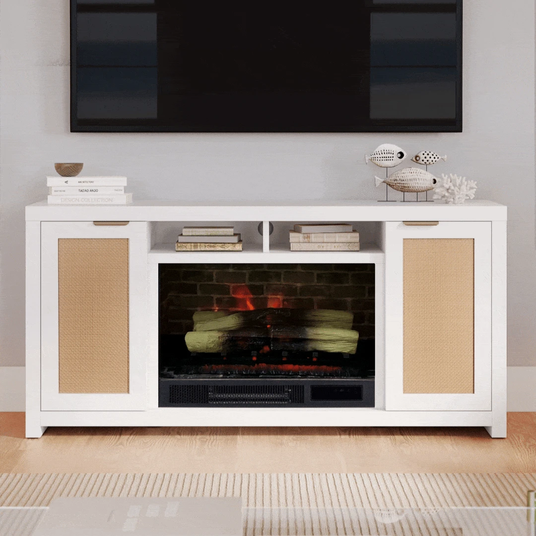 Bring coastal-inspired simplicity to your living space with the Country Living Inlet Cove Electric Fireplace TV Stand. Designed in partnership with Country Living Magazine, this console blends mixed materials with a modern twist, featuring rattan-front cabinet doors, antique brass handles, and a versatile white finish that complements both traditional and contemporary interiors. Spacious side cabinets with adjustable shelves provide ample storage, while integrated cord management keeps your space organized.
