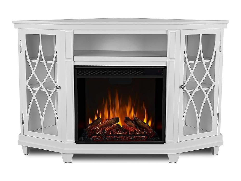 Add dramatic interest to the unused corner of your room with the addition of the Lynette Corner Electric Fireplace TV Stand. Not only are corner spaces difficult to decorate, they often are an untapped resource when it comes to rooms tight on space. The Lynette addresses this with quality, high class fashion. The console features a classic design with glass doors and decorative curved mullion bars. A center shelf and 4 side cabinet shelves offer space for your DVD player, cable box and media accessories. Taking center stage is the impressive VividFlame LED-lit firebox. You’ll love the soothing ambiance this life-like fireplace creates within your room. The resin cast logs glow for authenticity while the flickering flames rhythmically rise from behind, creating a spectacular illusion. The flame brightness can also be adjusted to create the perfect level of ambient lighting