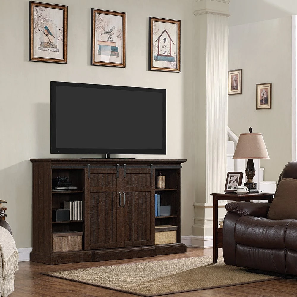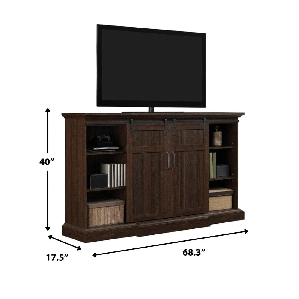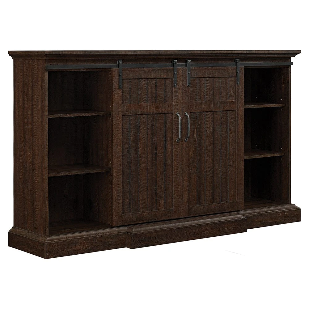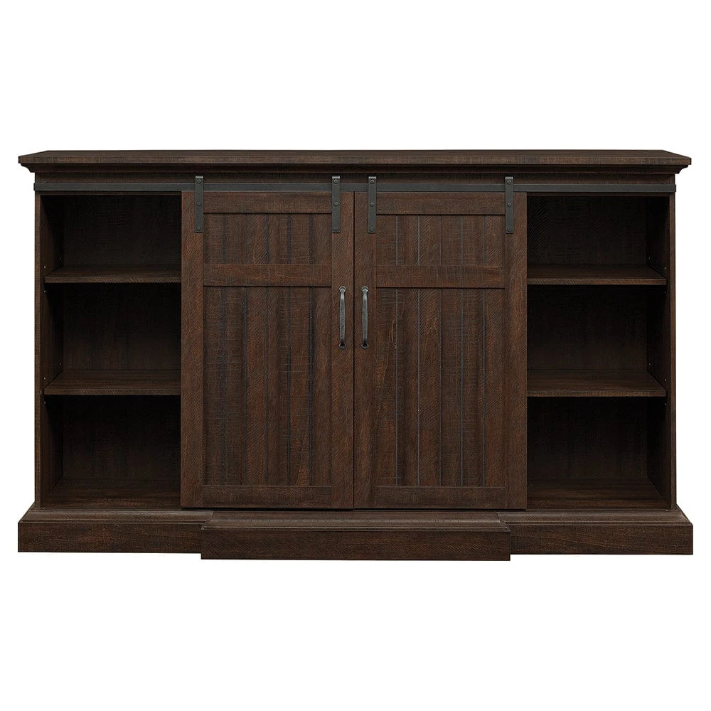 The Manning Infrared Electric Fireplace Entertainment Center creates country cottage charm with its saw cut appearance and rich espresso finish. Real sliding barn-style wood doors give you a fun and functional means of concealing the cabinet’s contents. An open center shelf easily holds your cable box or DVD player while the two side cabinets offer adjustable shelving to accommodate additional media and accessories. An integrated wire management system not only provides ventilation for your equipment but also keeps wiring neat and tidy.