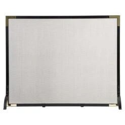Our Modern Ember Cecilia Single Panel Fireplace Screen is crafted from heavy-duty steel fortified with a durable black powder coated finish. The strong mesh screen acts as a barrier to help keep ember sparks inside the fireplace and away from the living area. The contemporary design of this single panel safety screen is highlighted by the stylish brass corners. This fireplace screen is secured with corner legs and two center legs that allow for easy tilt control. Curious hands and paws will be prevented from nearing the flames and hot ashes with the Cecilia Single Panel Fireplace Screen.