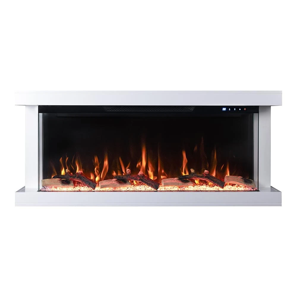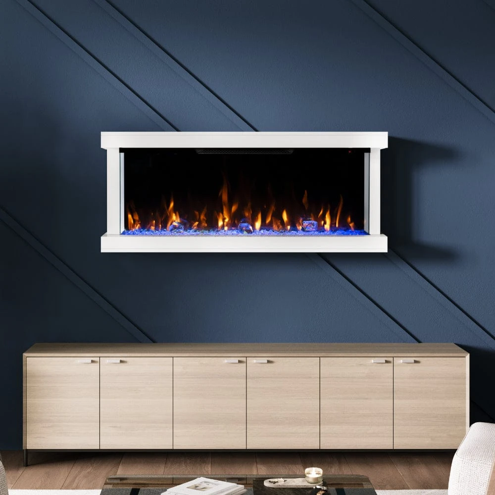 Introducing our Modern Ember Skyline 50-in Floating Wall Mount Electric Fireplace with 3-sided views and a sleek, modern mantel surround in a crisp white finish. Ideal for adding style, function and comforting warmth to any room in your home, the Skyline makes home upgrades a cinch. Easily customize your warmth with the user-friendly digital control panel, Wi-Fi operation using an downloaded app or go hands-free with voice commands through Alexa or Google smart home setups. This electric fireplace provides supplemental warmth for up to 400 sq. ft. and its year-round versatility allows operation with or without heat. The thermostatic heater and timer allow you to set your desired room temperature and choose heating durations from 30 minutes to 8 hours.