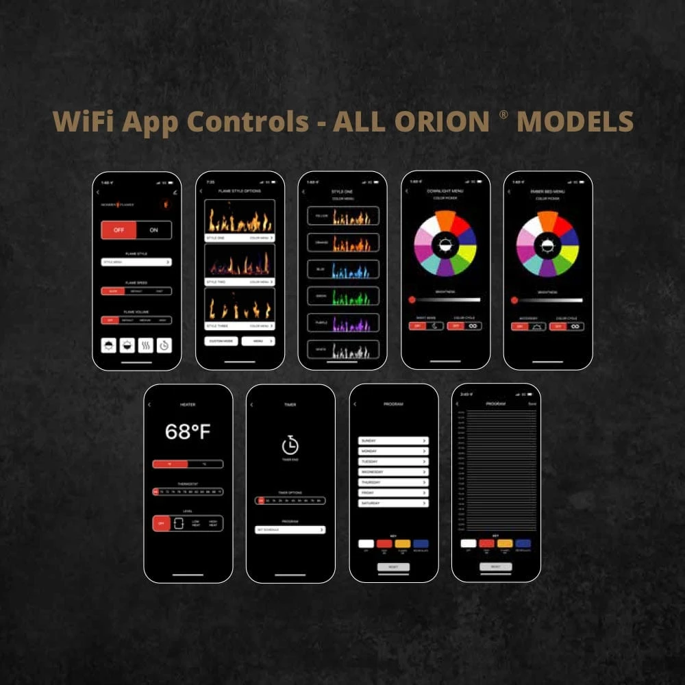 Discover the Modern Flames Orion Traditional Series: an enhanced electric fireplace powered by Heliovision Flame Technology. This innovative technology provides a premium flame experience with multi-dimensional flame and log appearance and consistent image quality from any angle. This zero-emissions electric fireplace insert features a high-efficiency ceramic heater for optimal warmth and a generous up to 30” high viewing area providing a captivating view of the flames. Easily control and customize your ambiance using the Modern Flames app via WiFi or included multi-function remote to adjust flame speed, colors and more! Illuminate the LED lit driftwood log set, multi-color down lighting, and multi-color ember bed with crystal glass media to create the perfect atmosphere for any occasion.