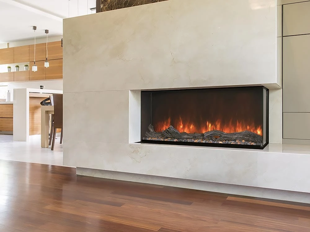 The Modern Flames 68-in Landscape Pro MultiView Built-In Electric Fireplace offers the most versatile installation options of any linear fireplace. Case in point, this unit can be built into a wall as a single sided, left corner, right corner or 3 sided bay. This unique design allows for the type of versatility that will allow you to dream big with your electric fireplace. At 68″ in size, the unit’s edge-to-edge viewing area provides an impressive unobstructed view of the high intensity LED lit flame effects. Additional lighting features include a glowing ember bed and down-lighting. All lighting options offer the full color spectrum to choose from, so you’ll be able to create a truly personalized viewing experience. The fireplace comes with 3 ember bed options, clear acrylic stone, black smoke acrylic crystals and a driftwood log set.