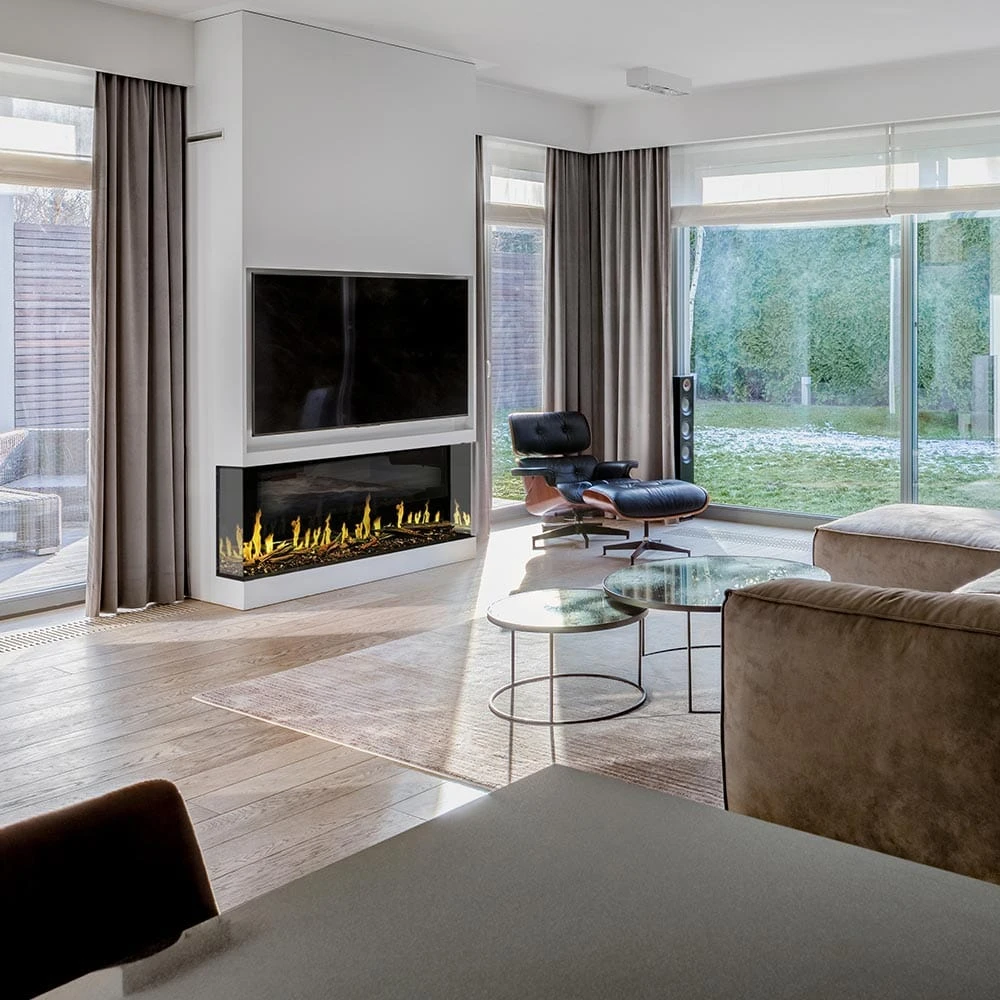 The Orion 120″ Multi Heliovision fireplace also features a supplemental heater that is capable of producing 5,000 or 10,000 BTUs depending on wiring – offering comforting warmth for areas between 400 – 800 Sq. Ft. in size. For year-round use, simply turn off the heater to continue to enjoy the calming ambiance of the flame effects. A multi-function remote is included, or alternatively, a feature-rich WiFi App can be downloaded for maximum control over the unit. Set the temperature, flame, colors, lighting and sounds all from your smart device.