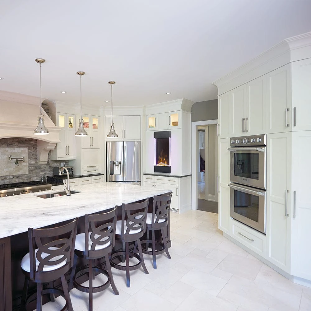 Integrated into the top of the unit is a powerful, fan-forced heater capable of warming rooms up to 400 Sq. Ft. in size. Depending on your needs and desired finished look, the fireplace can be mounted directly to a wall or partially recessed for a less obtrusive appearance. A multi-function remote is also included and offers complete operation of the various flame and lighting features as well as the heater.