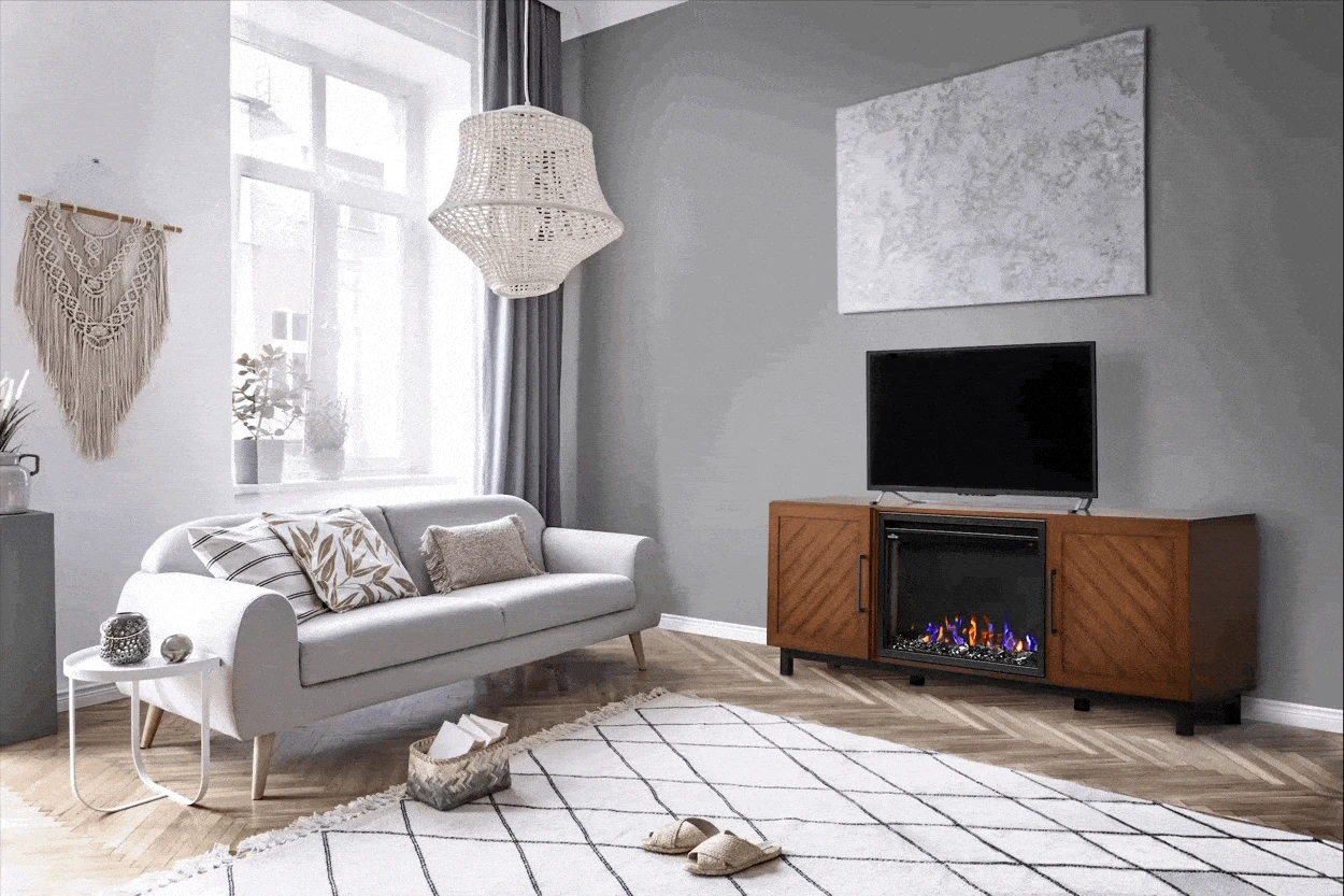 The Bella Electric Fireplace TV Stand by Napoleon offers a stylistic nod to rustic Scandinavian charm. The warm wood tone and angled slat inlay makes this unit perfect for rooms with a more masculine flare. Accent your office, family room, den, apartment or man cave with this well appointed media console. Behind both doors you’ll find shelved storage that is ideal for housing your movie collection, board games and books.