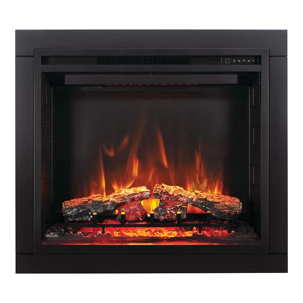 The Napoleon Element 36-in Built-In Electric Fireplace, paired with a 4-Piece Black Trim Kit, offers a versatile heating solution for your new or remodeled fireplace. Whether hardwired to 120/240V or plugged in with a compatible kit, installation is a breeze. The self-trimming firebox ensures a polished, finished look, providing up to 10,000 BTUs of heat output – the highest in its class when hard-wired to 240V. This fireplace delivers safe and efficient supplemental heat, reducing the need to adjust your main thermostat and contributing to savings on heating bills. Boasting decorative details, hand-molded logs, and adjustable flame effects for an authentic appearance, it also features ambient top lighting with 7 color settings for added ambiance. The advanced firebox allows independent operation of flames from the heat, enabling year-round use. Control temperature, flame color and speed, timer, and safety features effortlessly with the included remote or the control panel with LED display. With easy installation and energy efficiency, the Napoleon Element stands as an ideal choice for both homeowners and builders, providing a satisfying experience for any home or project.