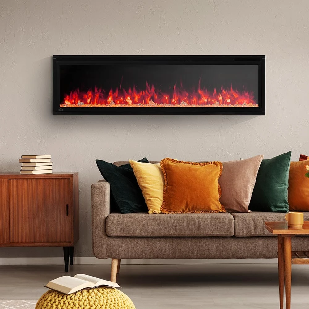 Introducing the new and improved Napoleon Entice 60-in Linear Electric Fireplace! The new Entice Series electric fireplaces features an enhanced flame pattern providing a fuller, higher and more realistic flame appearance. The reflective rear panel creates the illusion of a deeper depth with reflections from the crystal media enhancing the visual depth of the flames. The included multi-function remote offers total control, allowing you to cycle through 10 flame and flame/ember bed presets simultaneously while also customizing the flame intensity, blower, heat output, and timer. The modern touch screen panel is sleek and front facing for quick and easy adjustments. This versatile electric fireplace can be wall-mounted, partially or fully recessed, fitting seamlessly into any home and is a budget-friendly electric fireplace that is ideal solution for both renters and homeowners alike.