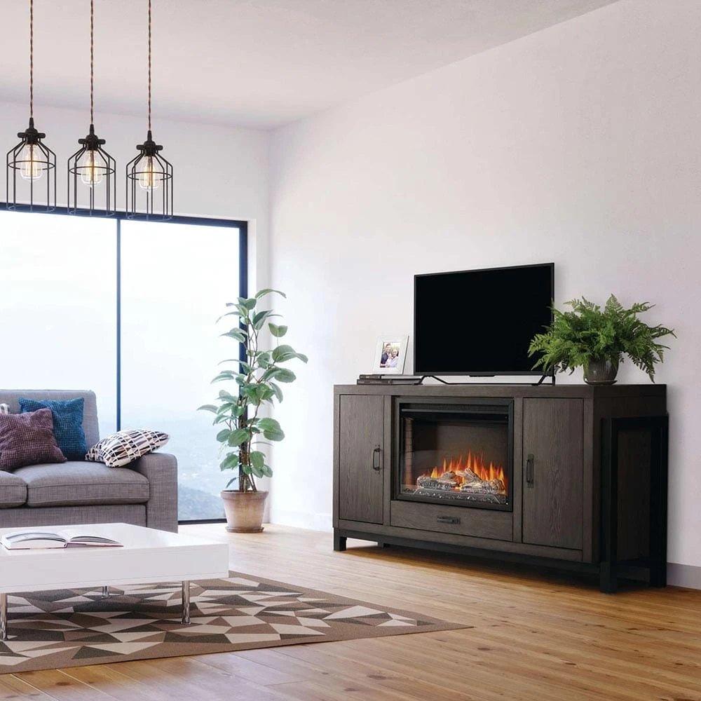 Modern & industrial or rustic & masculine, the Franklin Electric Fireplace TV Stand offers a design that speaks to multiple trends and is transitional in its style. With a pull-out lower drawer and two side cabinets, the Franklin offers more than enough storage for all your various needs. The media console easily accommodates flat screen TV’s up to 70″ in size, so you’ll have no problem creating the perfect setup for watching your favorite shows, sporting events and movies.