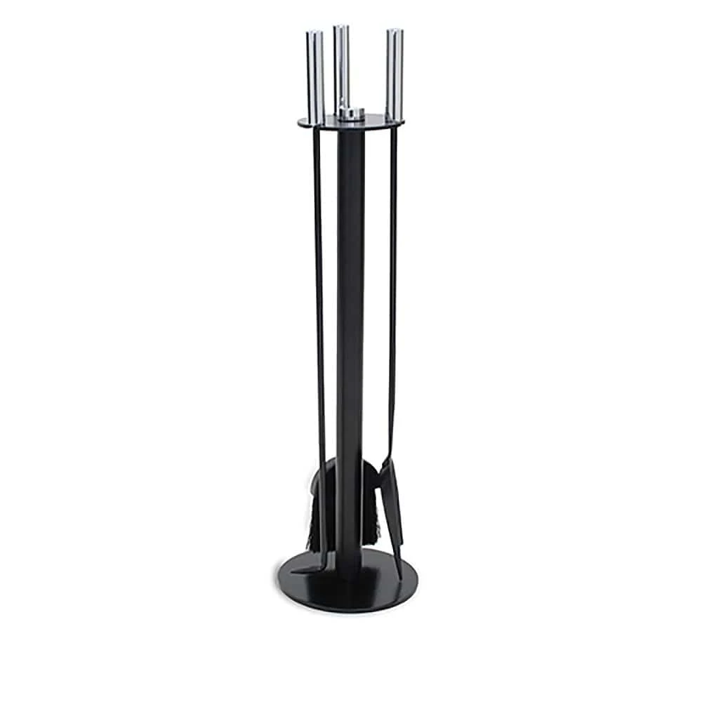 Modern and sophisticated with clean lines and a sleek black stand. Includes a poker, natural tampico fiber brush and shovel. The handles and post are accented with a highly polished stainless steel.