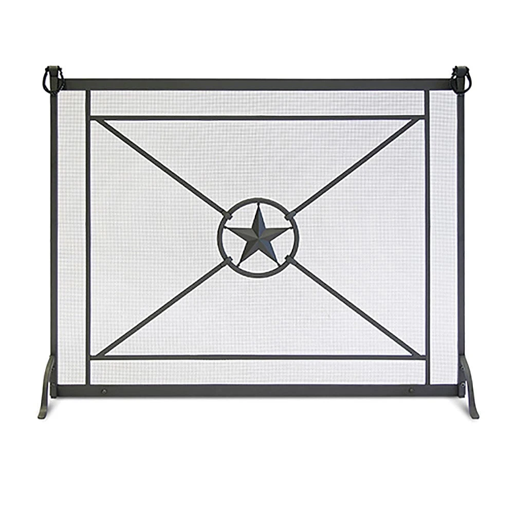 This proud screen is hand made from solid iron bar stock and hand forged by skilled craftsman. The three dimensional sturdy cast star sits centered in a forged steel ring of iron making it the focal point of this handsome screen. Leather accents may be left on or easily removed based on preference.