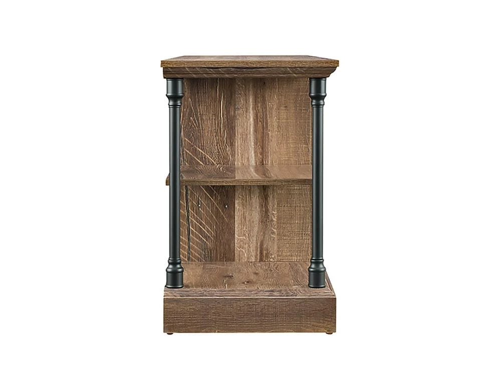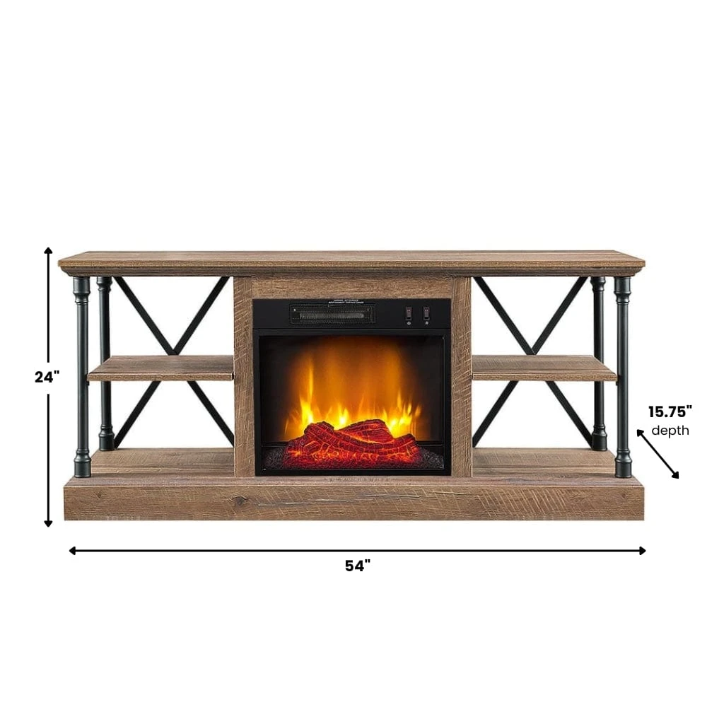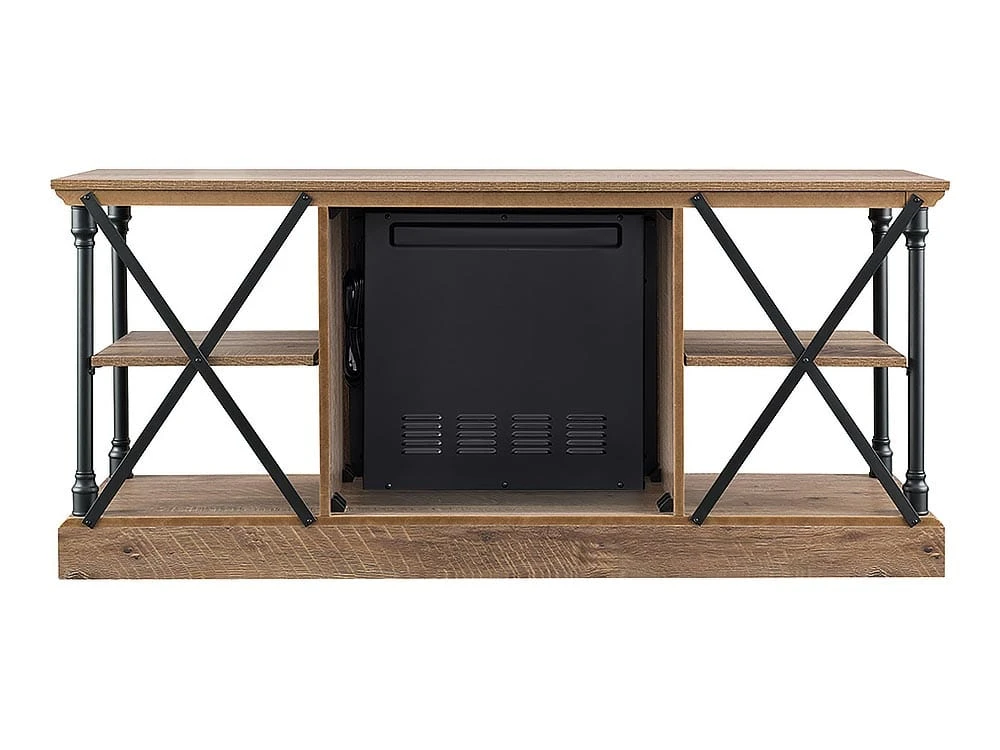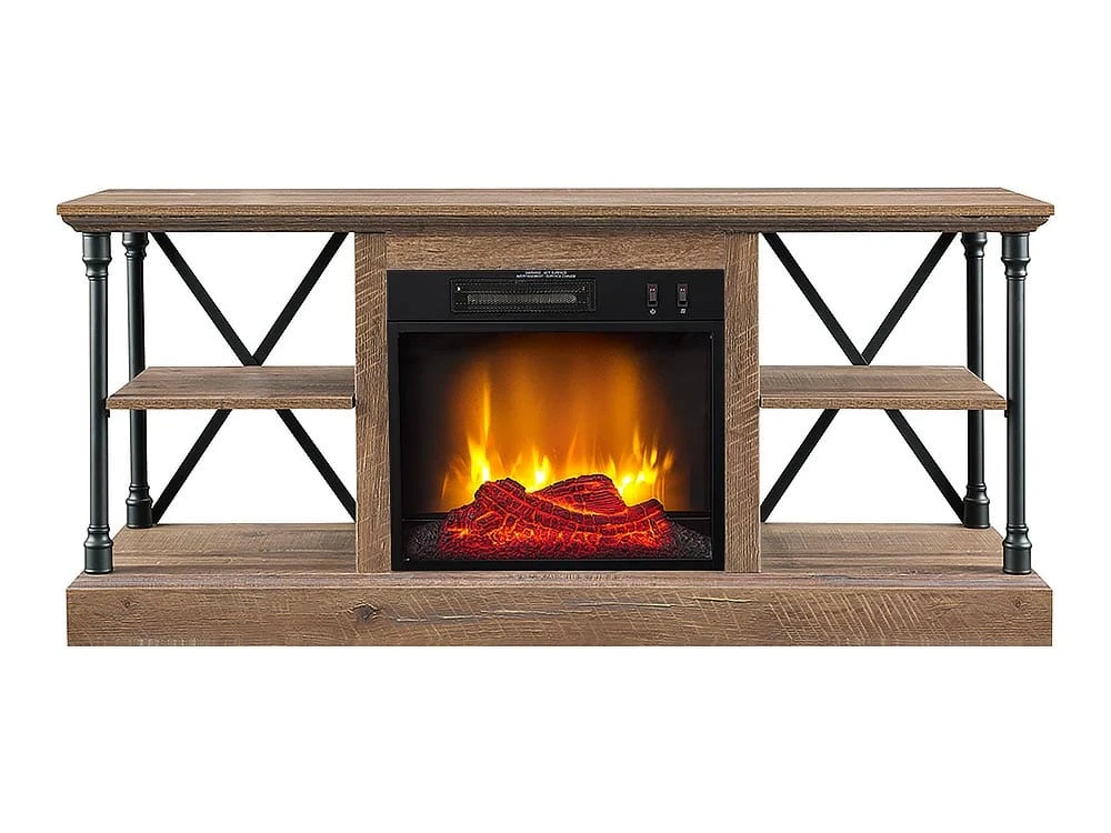 The Sheffield Electric Fireplace TV Stand is a great way to introduce the industrial design trend into your own home. This inspired design features an open concept with mixed metal & wood construction. Four side shelves offer the perfect space for electronics, media equipment, accessories or decorative keepsakes. The Sheffield is capable of holding flat screen TVs up to 65-In in size, making it easy to create the perfect setup for your TV/home theater.