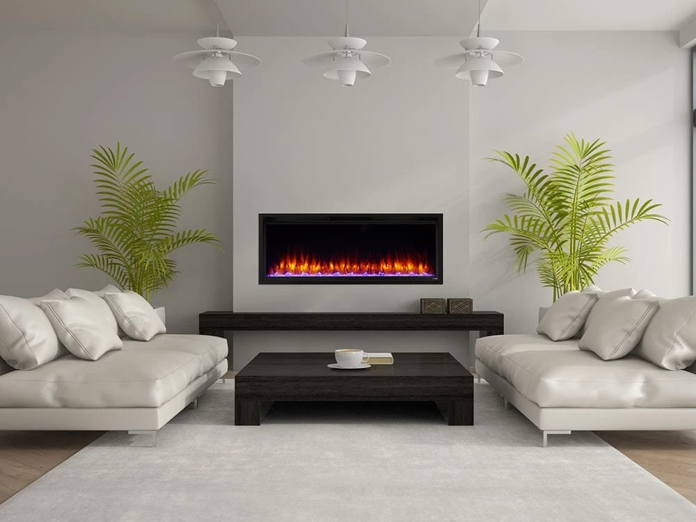 The SimpliFire 50-in Allusion Platinum Wall Mount Electric Fireplace is a great way to create a decorative focal point in your home. This high fashion linear fireplace is an incredibly versatile unit and can be surface mounted or fully recessed into your wall depending on your preference. With these two options you are also able to direct-wire or plug the fireplace into a standard wall outlet. The SimpliFire Allusion Platinum series makes use of advanced and energy efficient LED light projections to create ultra realistic & vibrant flame effects that rise with artistic motion from the ember bed. Choose from either a crystal or white stone ember bed (both are included with the unit). For added customization and dramatic visual flair, you’ll enjoy the 4 flame color options (Blue, Blue/Orange, Orange, Orange/Blue) as well as the 14 ember bed lighting combinations.To help maintain a comfortable temperature in your space, a 5,000 BTU supplemental heater can be activated to warm rooms up to 400 Sq. Ft. in size. This allows you to practice “Zone Heating” by only heating the room you are in, rather than raising your main thermostat and needlessly heating your entire home. For true year-round use and operation, the heater can be turned off while the flame projections remain. A multi-function remote control makes operation simple, easy and convenient, while manual touch controls offer yet another options for adjusting features.